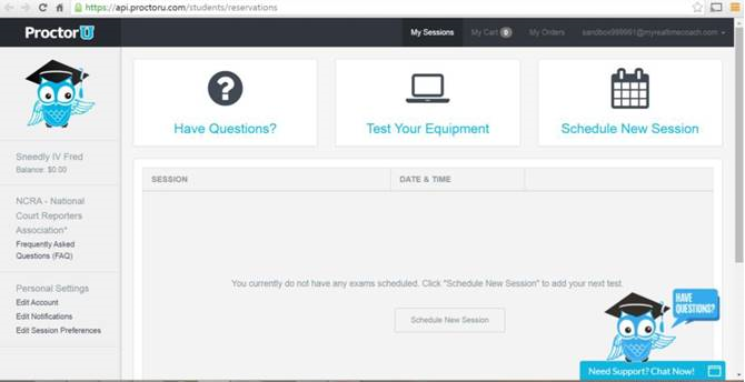 A new browser tab will load ProctorU.com. If this is your first visit to the ProctorU site, you may wish to first Test Your Equipment. If you have no other tests scheduled, you will be select Schedule New Session